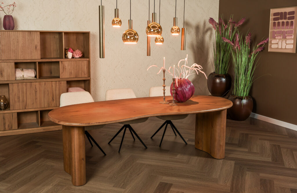 De vorm beïnvloedt de sfeer én functionaliteit. Een rechthoekige tafel werkt het best in langwerpige kamers, een ronde tafel voelt intiem en past mooi in vierkante ruimtes. Ovale tafels combineren beide voordelen. Een vierkante tafel is ideaal voor kleine huishoudens en compacte kamers. Bij The Lounge Zwolle adviseren we welke vorm het beste past bij jouw interieurstijl.