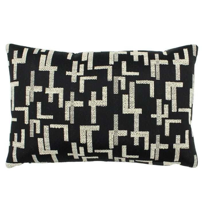 De diepzwarte kleur van het kussen wordt prachtig gecombineerd met het off-white patroon, waardoor het een luxe uitstraling krijgt. Dit kussen voegt een moderne en elegante touch toe aan je bank, bed of fauteuil.