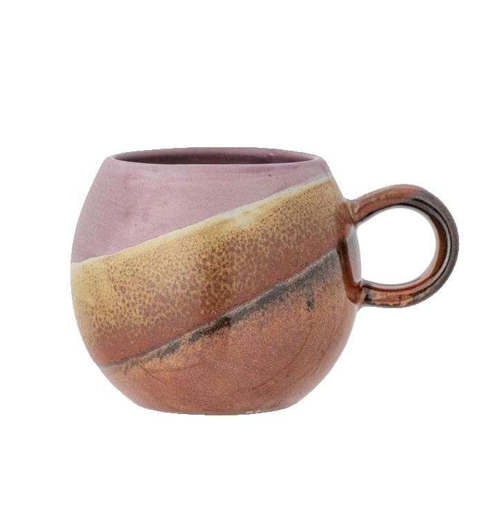 Op de tafel staat een kopje, bescheiden van omvang maar rijk van kleur. In een zachte combinatie van paars en bruin, lijkt het haast een geschilderd kunstwerk. Met elke slok biedt het een moment van rust, een kleine luxe te midden van het dagelijkse leven.
