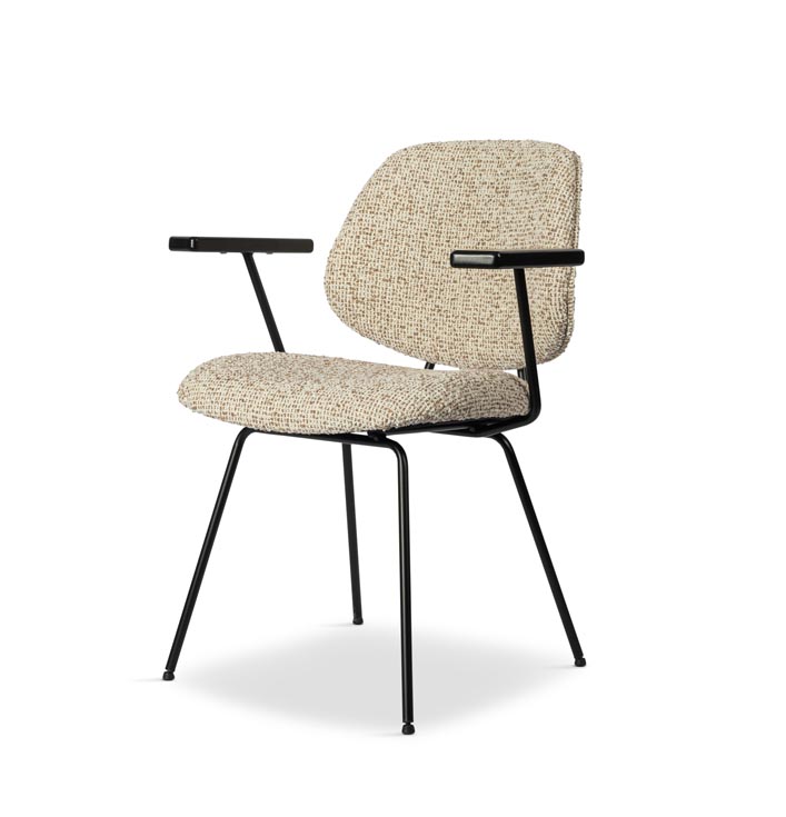 Deze eetkamerstoel combineert comfort en elegantie. De bekleding in een zachte beige tint straalt warmte uit, terwijl de zwarte poten en armleuningen zorgen voor een modern contrast. Perfect om jouw eetkamer een luxe uitstraling te geven!