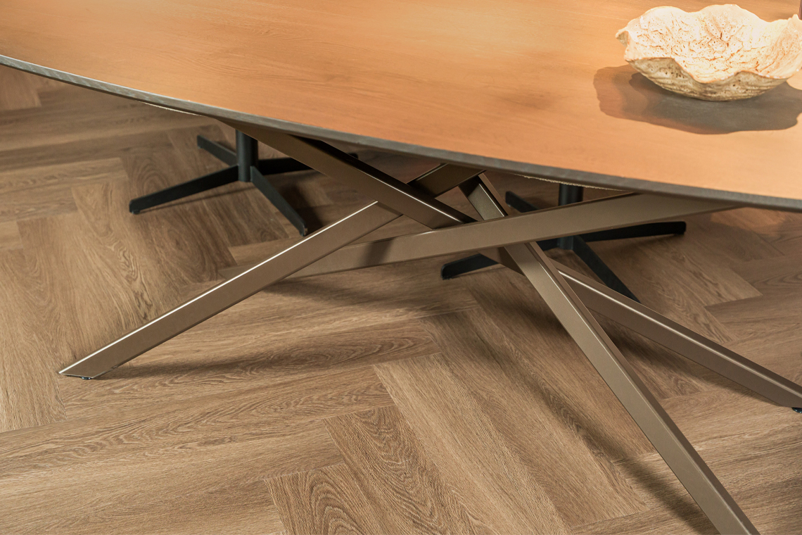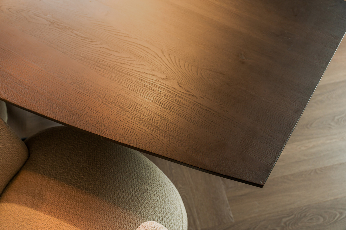 Deze tafel is gemaakt van hoogwaardig eikenhout, dat je volledig kunt personaliseren. Kies uit verschillende typen eikenhout en bepaal de kleur die perfect past bij jouw interieur. Met maar liefst 9 kleurenopties kun je variëren van natuurlijke tinten tot gedurfde, donkere nuances.