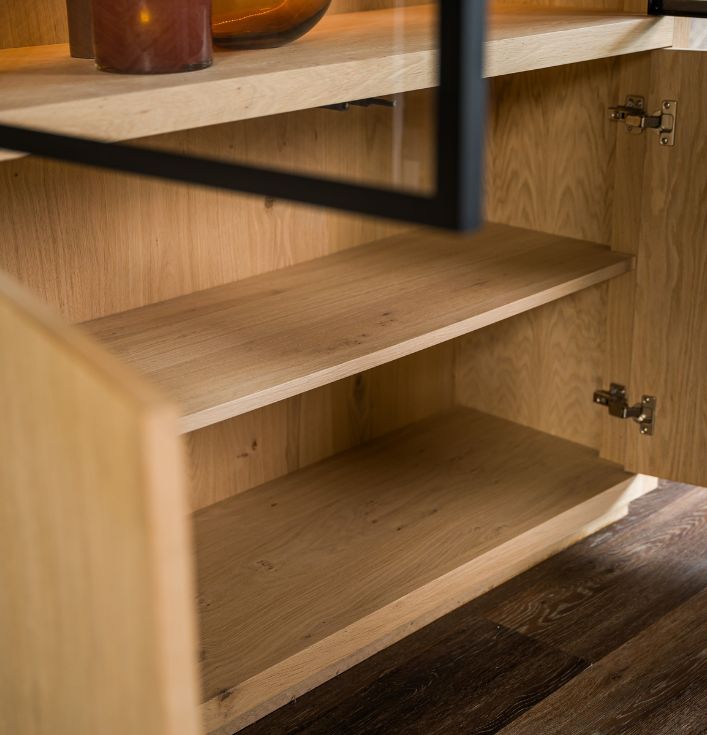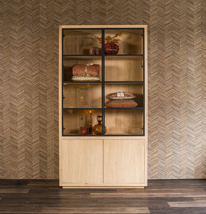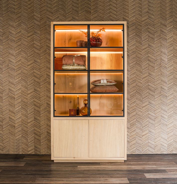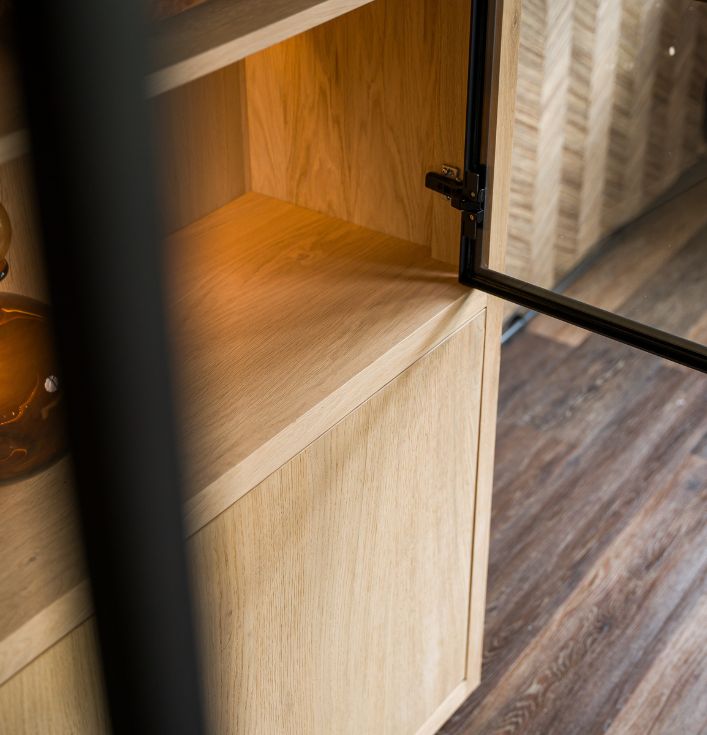 Met de Eiken Glaskast Victor met Verlichting maak je een statement in elke ruimte. Of je de kast nu in de woonkamer, hal of eetkamer plaatst, de verlichting zorgt ervoor dat hij altijd de aandacht trekt. Door de combinatie van het warme eikenhout en het glas past de