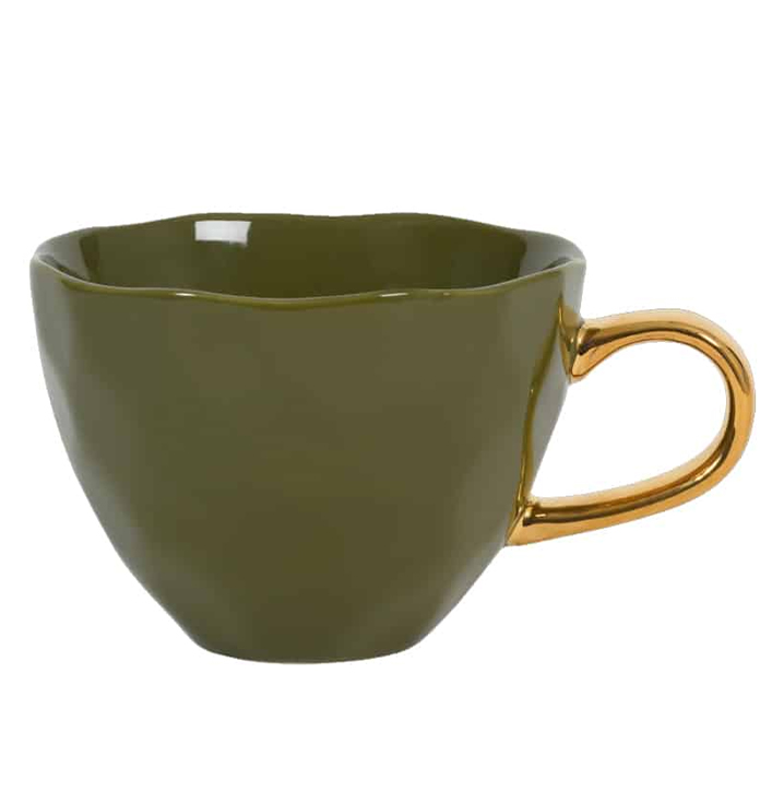 Begin je dag met een glimlach en de Good Morning Cup Fir Green! Deze mok heeft een prachtige donkergroene kleur en een gouden randje, wat zorgt voor een chique