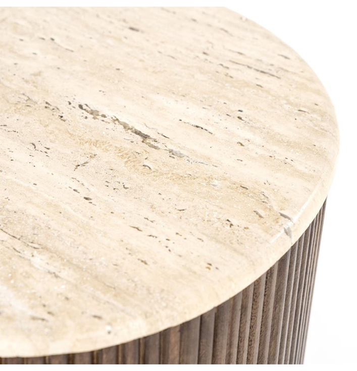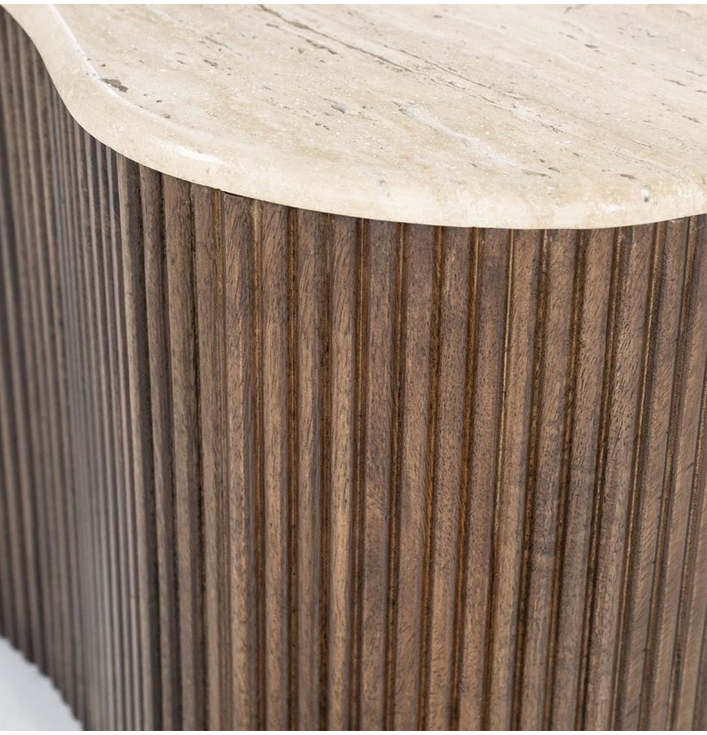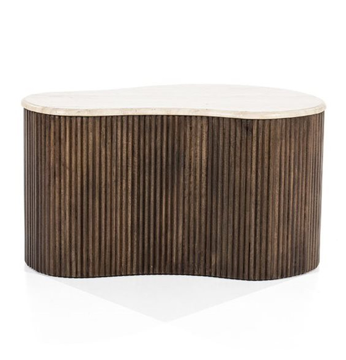 woonkamer. Het gebruik van hout en marmer maakt deze tafel uniek en veelzijdig.