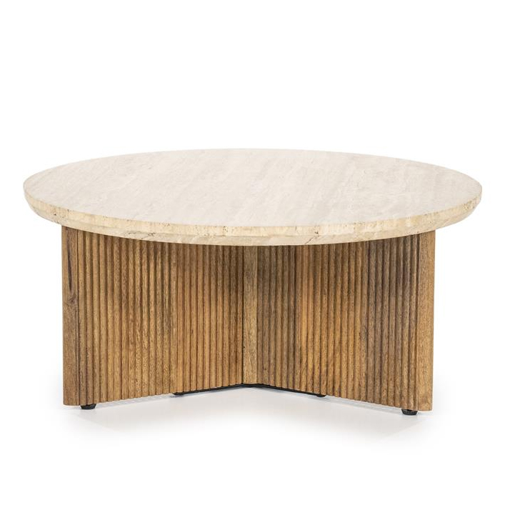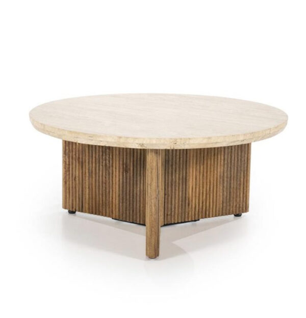 De Salontafel Sara is een verfijnde toevoeging aan elk interieur. De tafel heeft een rond ontwerp met een beige en bruine kleurstelling, die perfect past in verschillende woonstijlen. Het houten frame in combinatie met het travertin blad geeft de tafel