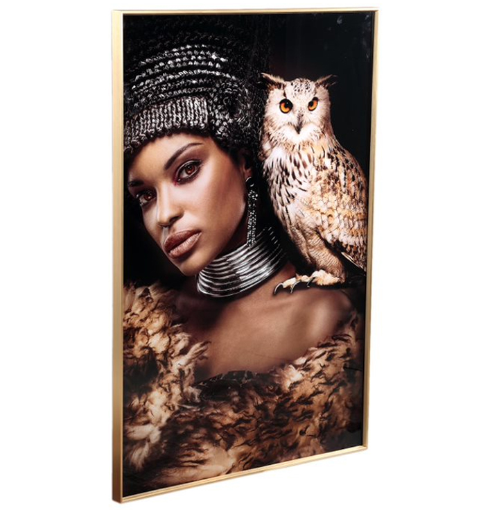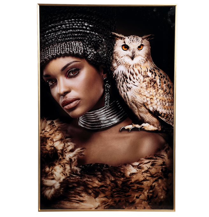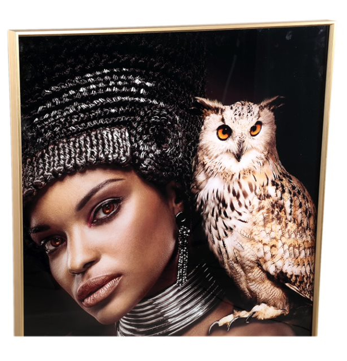 Het Schilderij Strong Woman is een must-have voor wie van indrukwekkende kunst houdt. Dit schilderij heeft een zwarte achtergrond die zorgt voor een luxe uitstraling. De gedetailleerde ogen van de uil en de