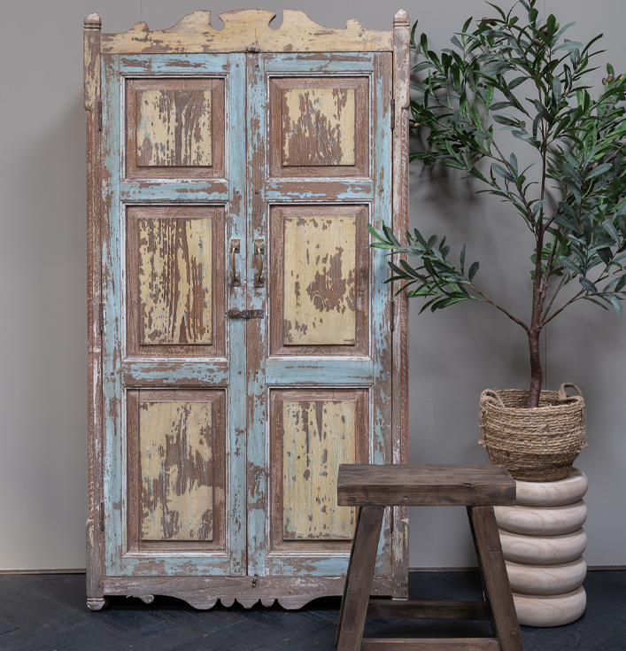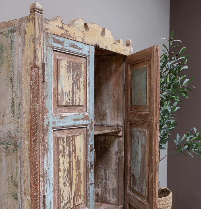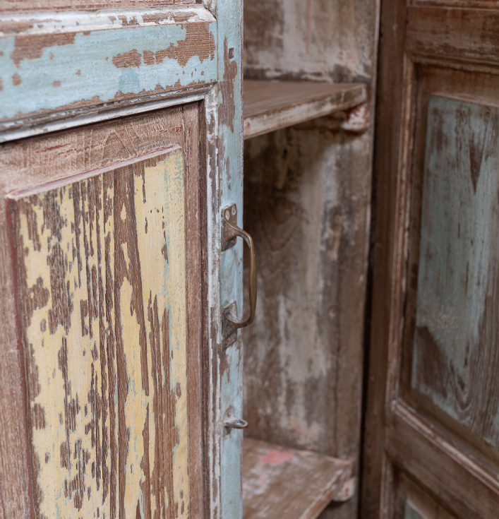 Een leuke unieke kast voor in jouw interieur. Met zijn meerdere kleuren bruin, blauw en geel heeft deze kast een uniek en speels karakter. De kast is voorzien van twee deuren. Het is een handige kast om bijvoorbeeld je boeken in op te bergen.