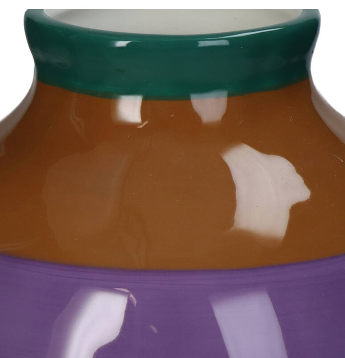 de combinatie van paars, oranje en groen biedt deze vaas een levendige en speelse uitstraling. De strepen zorgen voor een dynamisch effect, waardoor de vaas niet alleen functioneel is, maar ook een opvallend decoratief element in je ruimte.