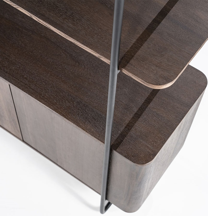 Wandkast James Bruin is een prachtige aanwinst voor elk interieur. Ten eerste, de kast is vervaardigd uit bruin mangohout, wat zorgt voor een warme uitstraling, terwijl de stoere metalen afwerking een industrieel karakter